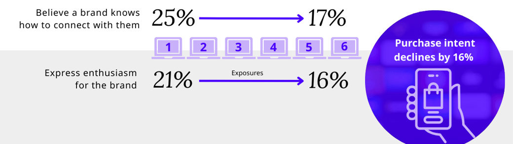 - Brand perception suffers – The percentage of viewers who felt a brand “knows how to connect with them” dropped from 25% (after one exposure) to just 17% after six. Excitement for the brand also declined, with only 16% of viewers expressing enthusiasm, compared to 21% after a single exposure.