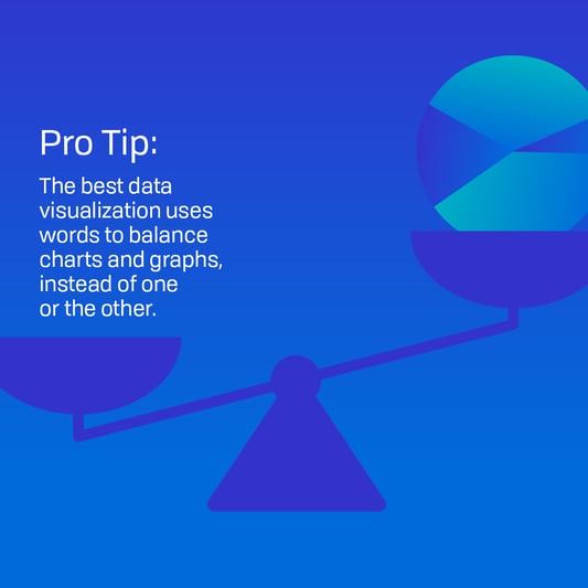 With your chosen insights now well-defined, it is time to input your data into your visualization software. In the designing phase, simplicity is key. Many designs may look aesthetically pleasing but are more difficult to draw insights from. As a rule, it is best to stick with the basics—those being bar charts, line charts and pie charts. With a simpler base, your data will come across clearly, and your team can exercise their creativity through the choice of images and eye-catching color to draw attention to the visual. Brief descriptions can also be strategically utilized to compliment your graphics and make them easier to understand.